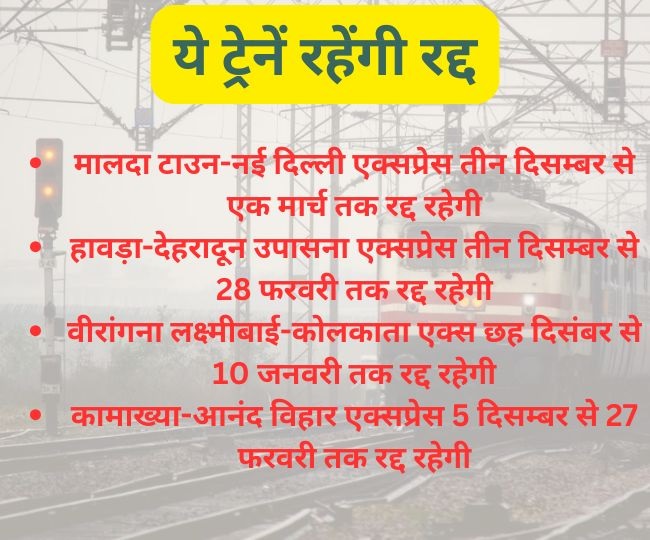गाड़ी सं. 14003 मालदा टाउन-नई दिल्ली एक्सप्रेस तीन दिसम्बर से एक मार्च तक रद्द रहेगी। गाड़ी सं. 12327 हावड़ा-देहरादून उपासना एक्सप्रेस तीन दिसम्बर से 28 फरवरी तक रद्द रहेगी। वहीं परिचालन के दिनों में कमी कर के चलायी जाने वाली ट्रेनें जिसमे गाड़ी सं. 12988 अजमेर-सियालदह एक्सप्रेस प्रत्येक मंगल, गुरू एवं शनिवार को रद्द व गाड़ी सं. 12987 सियालदह-अजमेर एक्सप्रेस - प्रत्येक बुध, शुक्र एवं रविवार को रद्द रहेगी।