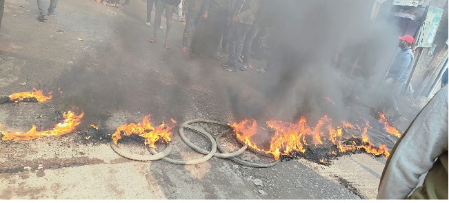 सड़क जाम के दौरान आगजनी करते आक्रोशित लोग