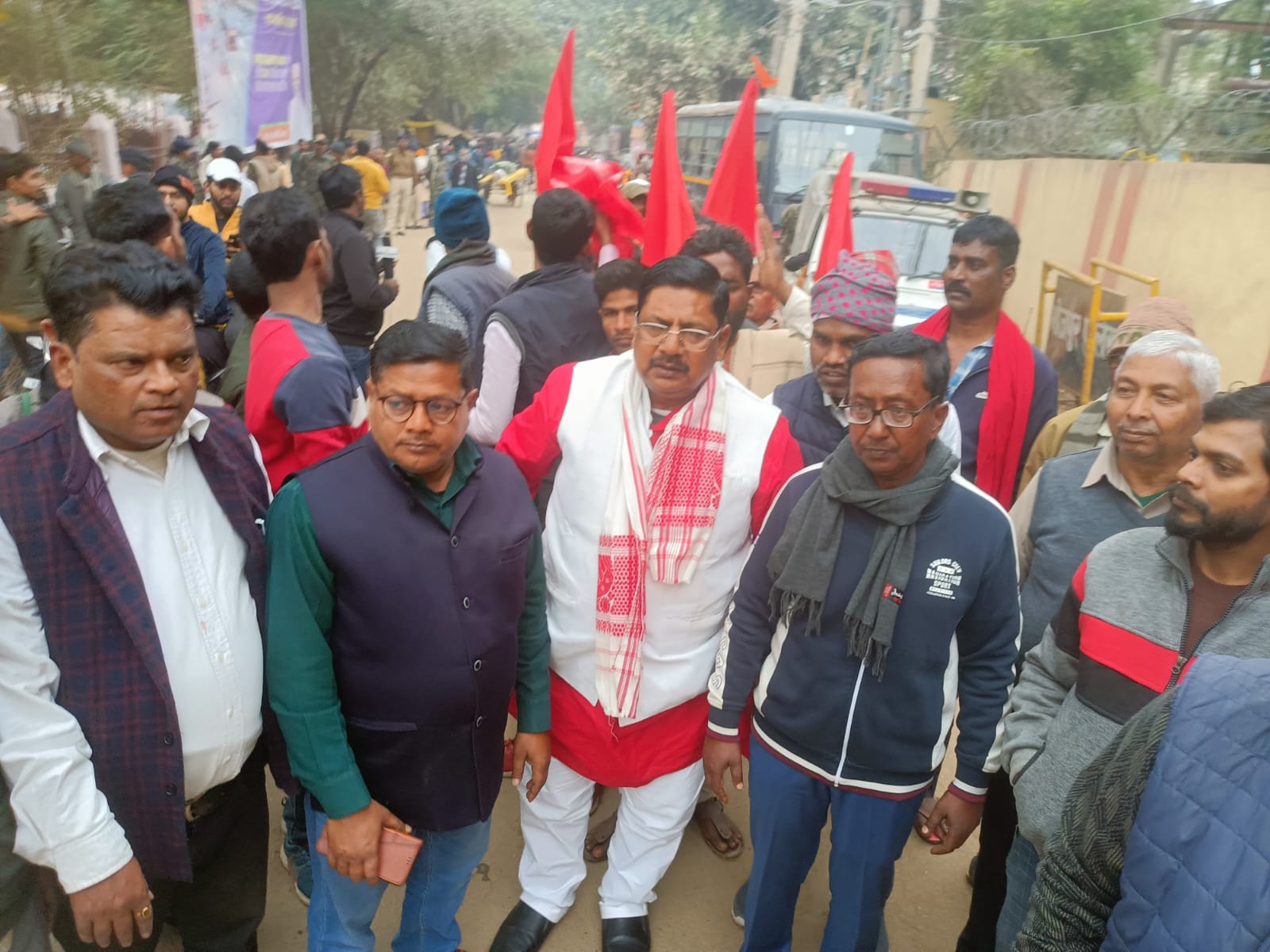 कचहरी रोड में विरोध-प्रदर्शन करते भाकपा-माले विधायक सुदामा प्रसाद समेत पार्टी के अन्य नेतागण। फोटो- जागरण