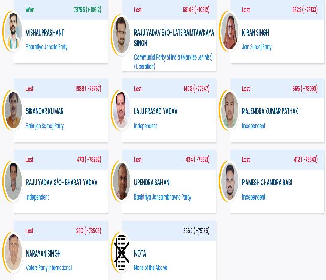माले के राजू यादव 68143 वोट के साथ दूसरे नंबर पर रहे। 5622 वोट के साथ जन सुराज पार्टी की उम्मीदवार किरण सिंह तीसरे नंबर पर रहीं।