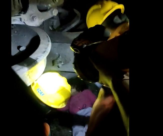 (ट्रेन के नीचे फंसे यात्री को निकालती रेस्क्यू टीम)