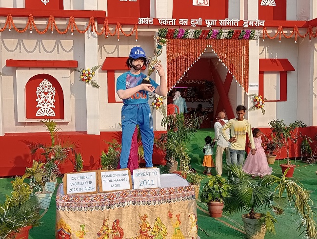 Bihar News बिहार के बक्सर जिले में दुर्गा पूजा के मौके पर क्रिकेट विश्व कप की दीवानगी भी दिखाई दे रही है। यहां के पूजा पंडालों में विश्व कप में भारतीय टीम की जीत के लिए प्रार्थना की जा रही है। इसके साथ ही वर्ल्ड कप की थीम पर पंडाल में सजावट की गई है। इसके लिए स्टार क्रिकेटर की मूर्ति भी बनाई गई है।