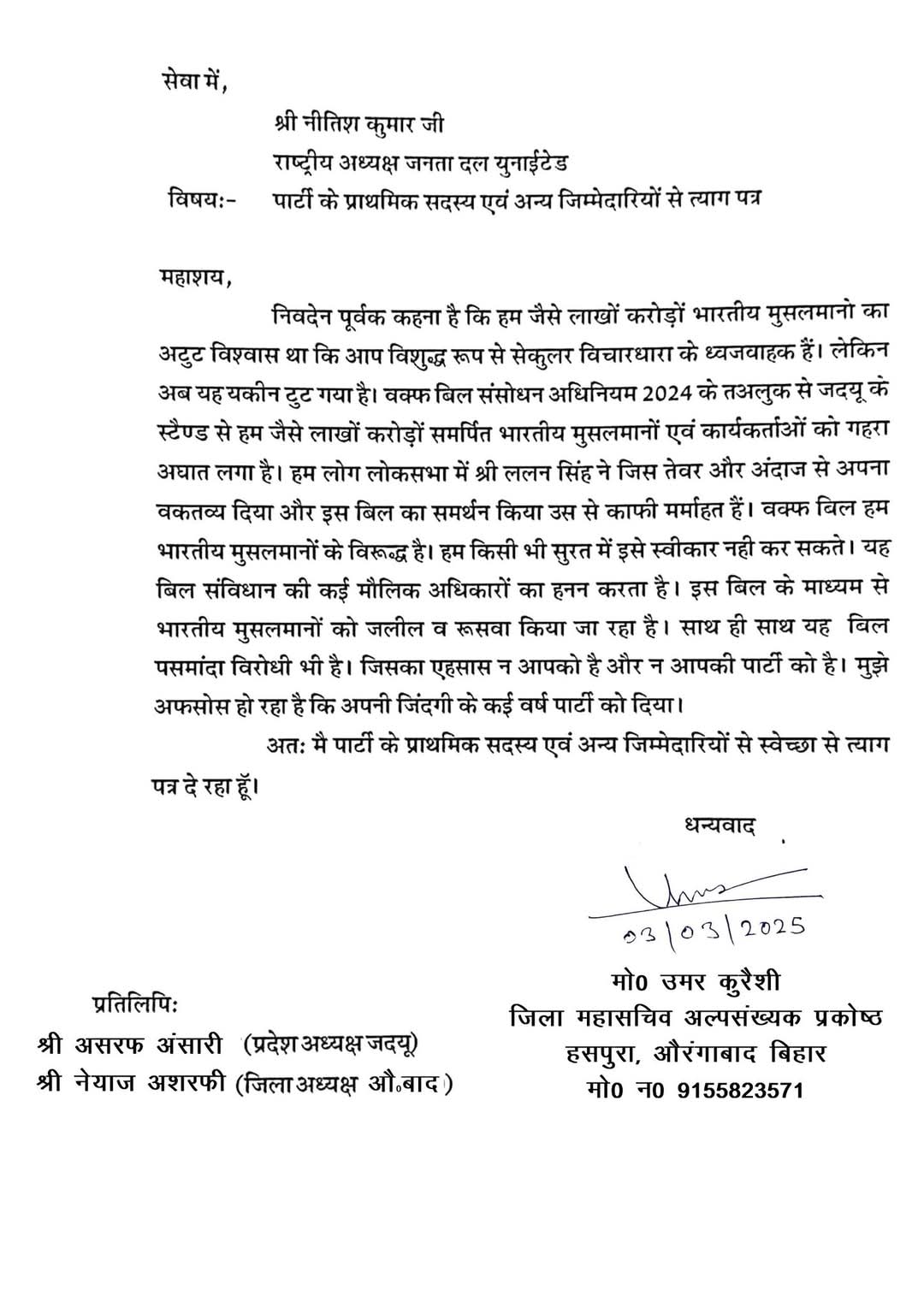 संवाद सहयोगी, सिकरहना। वक्फ संशोधन बिल (Waqf Amendment Bill) बुधवार की देर रात लोकसभा से पारित होने के साथ ही जदयू में विरोध के स्वर उठने लगे हैं। इस बिल का समर्थन जदयू ने भी किया था। इस बात से नाराज जदयू के वरिष्ठ नेता डॉ. मोहम्मद कासिम अंसारी ने पार्टी के सभी पदों सहित प्राथमिक सदस्यता से इस्तीफा देने की घोषणा की है।