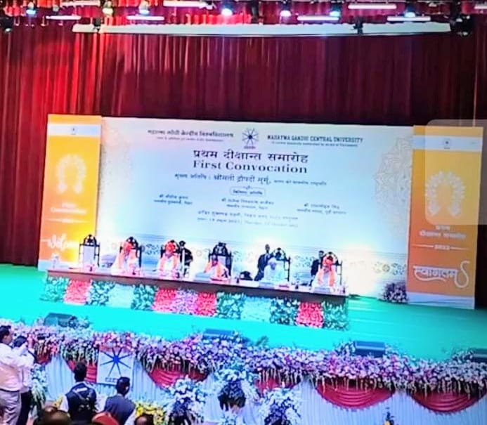 अब वह दीक्षा समारोह में बतौर मुख्य अतिथि उपस्थित हुईं हैं। तस्वीर के माध्यम से देख सकते हैं कि राष्ट्रपति प्रथम दीक्षा समारोह में मंच पर पहुंच चुकी हैं। महात्मा गांधी प्रेक्षागृह में राज्यपाल ने अंगवस्त्र पहनाकर राष्ट्रपति का अभिनंदन किया।