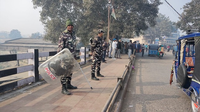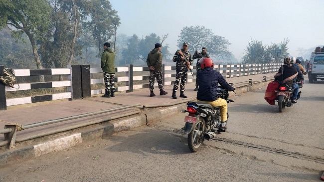 रक्सौल : भारत-नेपाल मैत्री पुल पर भार यात्रा की सुरक्षा के लिए डॉग स्क्वॉड के साथ तैनात एसएसबी जवान।
