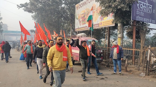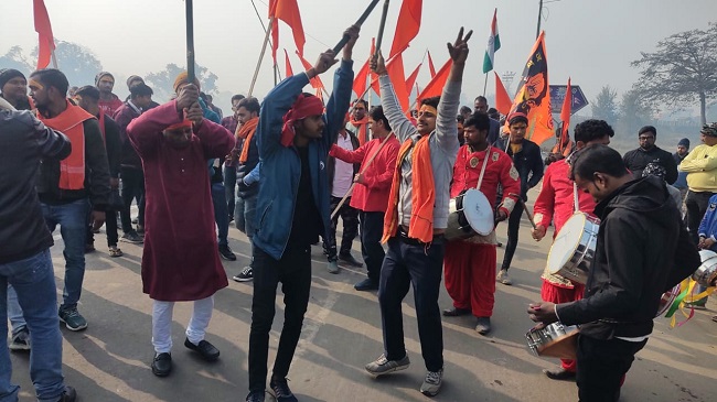 रक्सौल में भारत-नेपाल मैत्री पुल पर बजरंग दल के कार्यकर्ता ढोल-नगाड़े की धुन पर झूमते हुए।