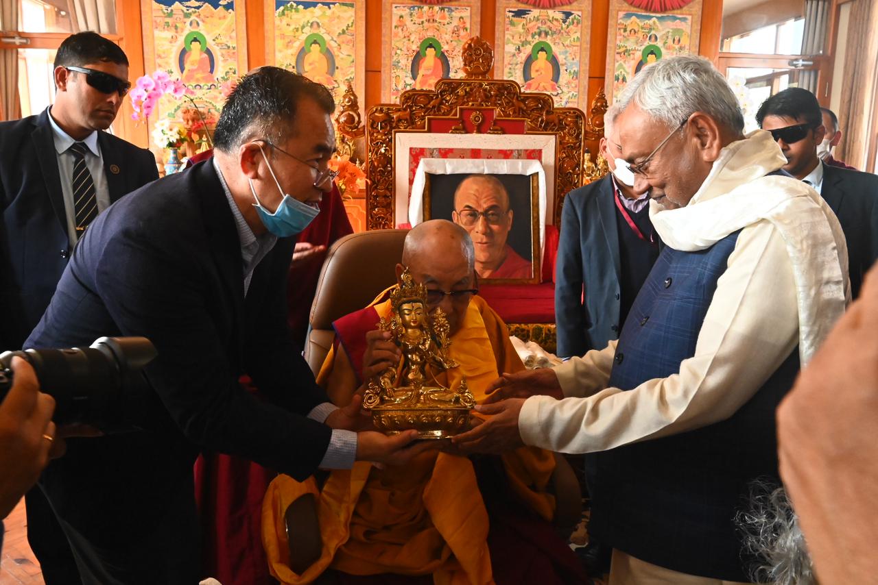 सीएम नीतीश कुमार ने दलाई लामा को बुद्ध की प्रतिमा भेंट की।