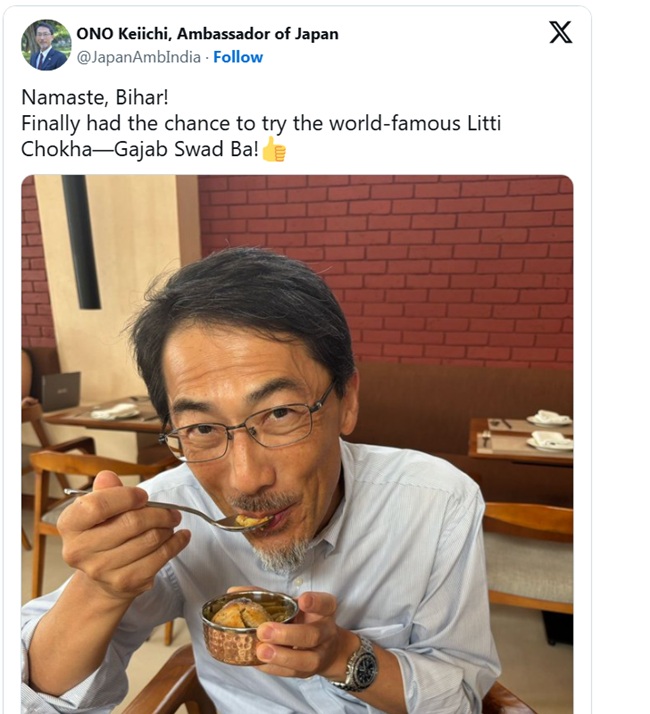 दरअसल, भारत में जापान के राजदूत केइची ओनो बिहार के मशहूर व्यंजन लिट्टी चोखा के मुरीद हो गए। और इसका लुत्फ उठाते हुए अपनी एक वायरल तस्वीर ऑनलाइन शेयर करते हुए जमकर तारीफ की है।