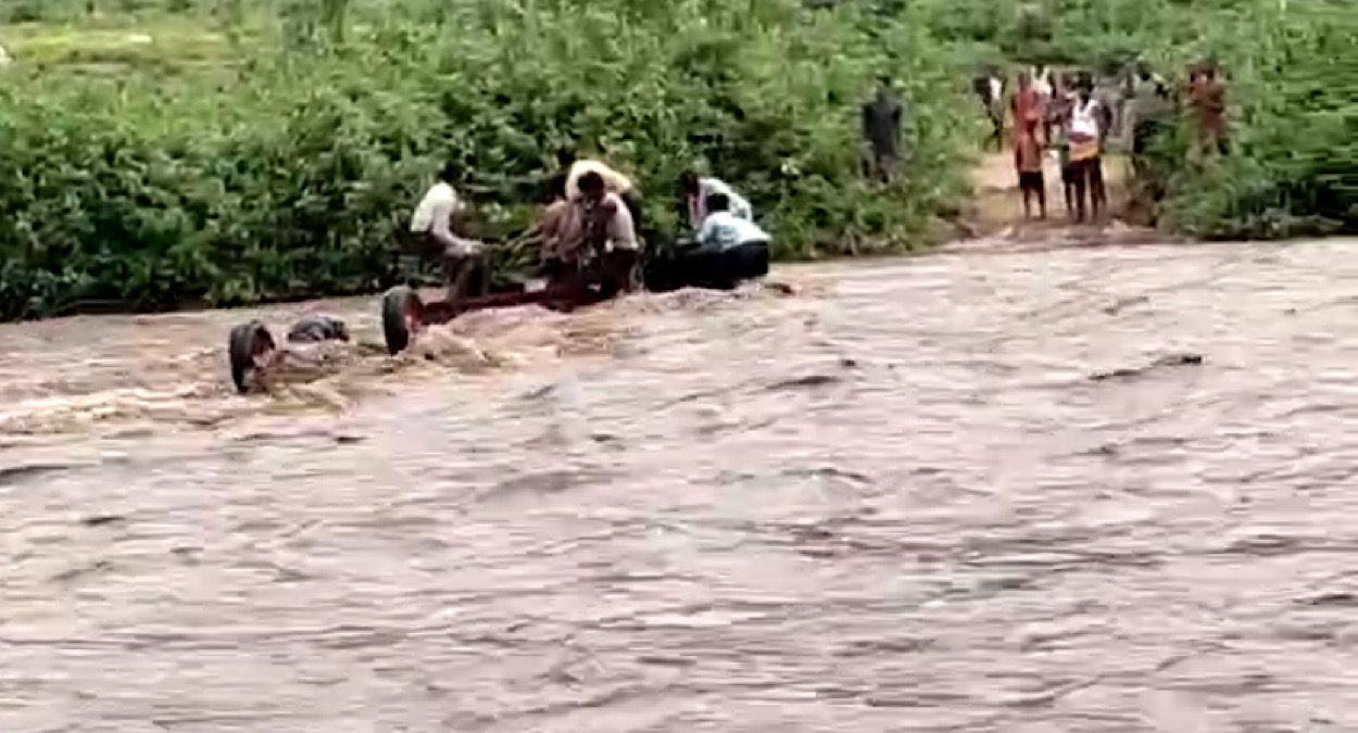 ट्रैक्टर बहने के पहले उसे पकड़कर बैठे लोग