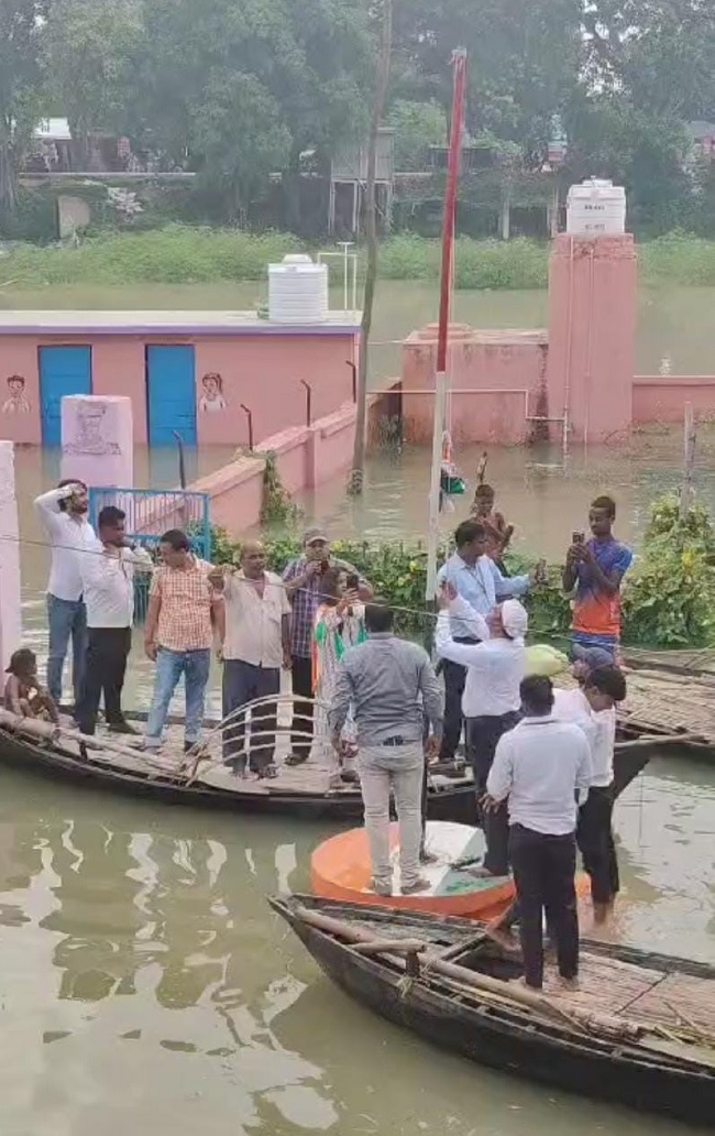 बाढ़ के पानी में डूबे उच्चतर माध्यमिक विद्यालय नयागांव-गोढ़ियासी में नाव के सहारे पहुंचकर झंडोत्तोलन करते प्रधानाध्याक व मौजूद शिक्षकगण। - जागरण