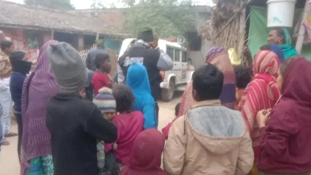 मृतका के घर के पास जुटी भीड़। (जागरण)