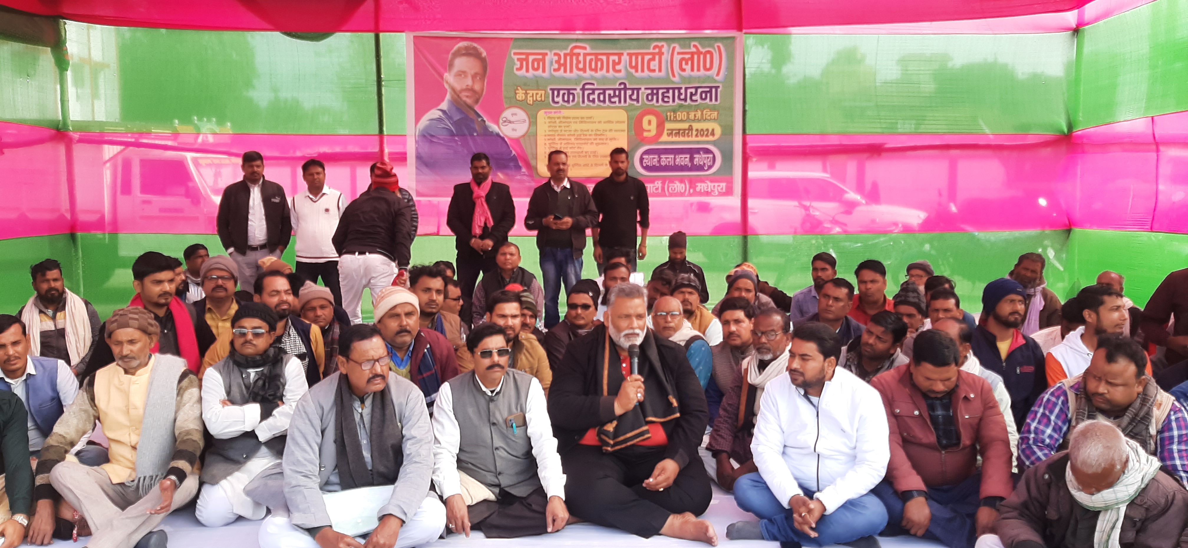 महाधरना को संबोधित करते राजेश रंजन उर्फ पप्पू यादव।