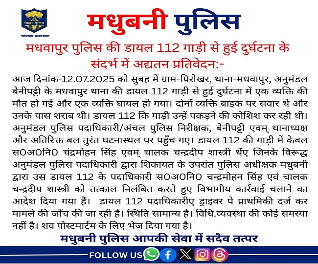यह एक गंभीर घटना है जिसमें दो की मौत हो गई। यह घटना मधवापुर थाना क्षेत्र में हुई है, जहां डायल 112 की गाड़ी ने एक बाइक को रोकने की कोशिश की, जिसमें दो लोग सवार थे और शराब ले जा रहे थे। इस घटना के बाद बड़ी संख्या में लोग इकट्ठे हो गए और पुलिस ने तुरंत कार्रवाई की। एसडीपीओ बेनीपट्टी ने घटनास्थल पर पहुंचकर स्थिति को नियंत्रित किया और डायल 112 के अधिकारी एएसआई चंद्रमोहन सिंह के खिलाफ शिकायत दर्ज की है। एएसआई चन्दमोहन सिंह को निलंबित कर दिया गया है। इसके साथ ही पुलिस ने एफआईआर दर्ज कर जांच शुरू कर दी है। वहीं शव को पोस्टमार्टम के लिए सदर अस्पताल मधुबनी भेज दिया गया है। स्थिति अब सामान्य है और पुलिस आगे की कार्रवाई में जुटी हुई है।