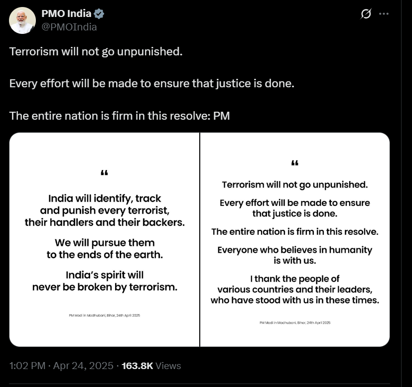 प्रधानमंत्री मोदी ने साफ-साफ शब्दों में कहा कि हम दुनिया के कोने-कोने तक आतंकियों का पीछा करेंगे। भारत की भावना कभी नहीं टूटेगी और आतंकवादियों को दंडित किया जाएगा। हम न्याय सुनिश्चित करने के लिए हर संभव प्रयास करेंगे। पूरा देश इस संकल्प पर अडिग है और मानवता में विश्वास रखने वाला हर व्यक्ति हमारे साथ है।
