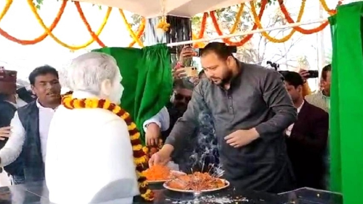 पूर्व सांसद स्व. रामदेव भंडारी की प्रतिमा का अनावरण करते उपमुख्य मंत्री तेजस्वी यादव।