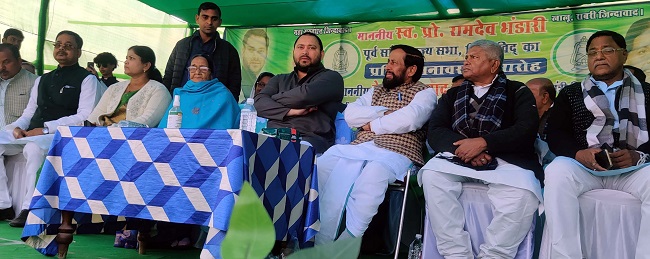 उपमुख्यमंत्री तेजस्वी यादव झंझारपुर निवासी प्रसिद्ध समाजवादी राजद के शीर्ष नेता पूर्व राज्य सभा सांसद प्रो. रामदेव भंडारी की प्रतिमा अनावरण के बाद जन सभा को झंझारपुर थाना के समक्ष संबोधित कर रहे थे।