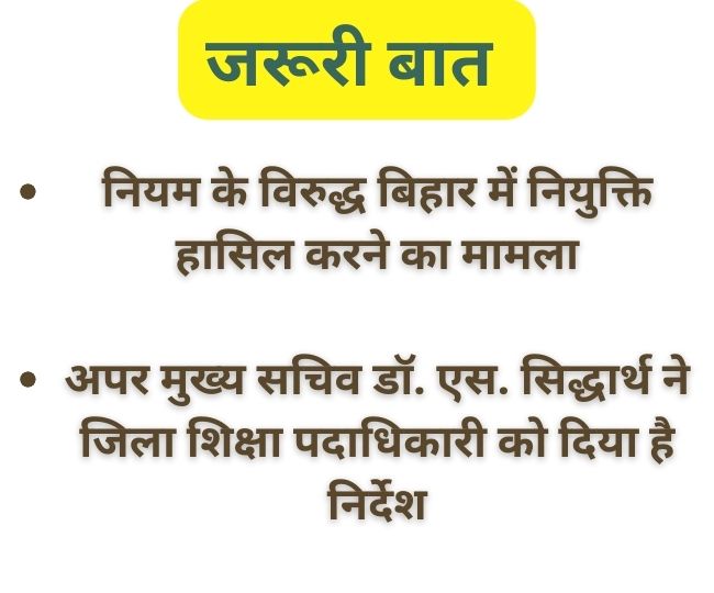 नियम के विरुद्ध बिहार में नियुक्ति हासिल करने वाले इन शिक्षकों की जांच का आदेश जारी कर दिया गया है। डीपीओ स्थापना ने सभी बीईओ से रिपोर्ट सौंपने को कहा है।