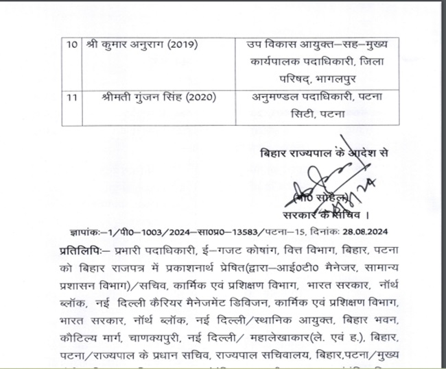 - प्रदीप सिंह, अनुमण्डल पदाधिकारी, दानापुर, पटना को स्थानांतरित करते हुए अगले आदेश तक उप विकास आयुक्त-सह-मुख्य कार्यपालक पदाधिकारी, जिला परिषद्, भागलपुर के पद पर पदस्थापित किया गया है।