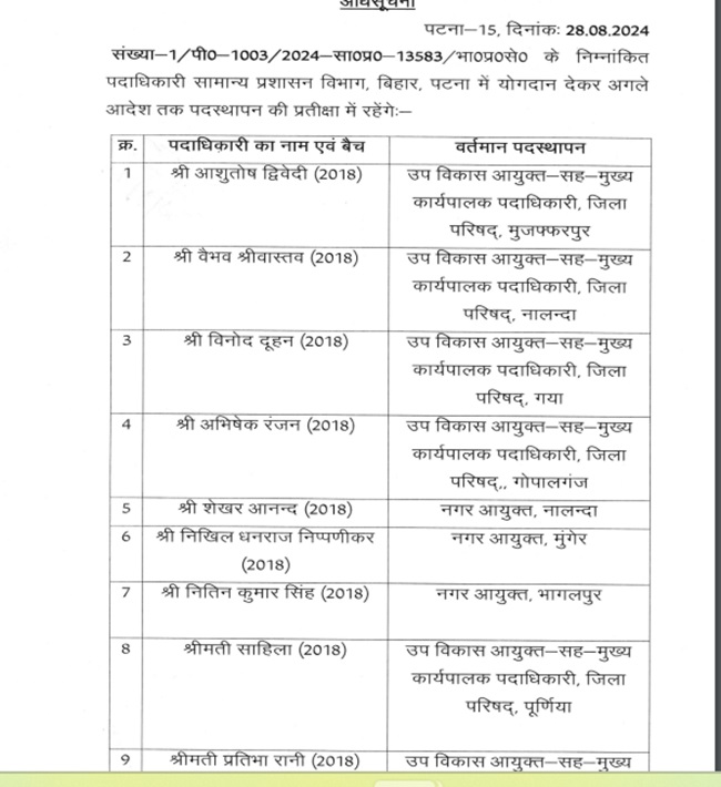 - श्रीकान्त कुण्डलिक खाण्डेकर, अनुमण्डल पदाधिकारी, पटना सदर, पटना को स्थानांतरित करते हुए अगले आदेश तक उप विकास आयुक्त-सह-मुख्य कार्यपालक पदाधिकारी, जिला परिषद्, नालन्दा के पद पर पदस्थापित किया जाता है।