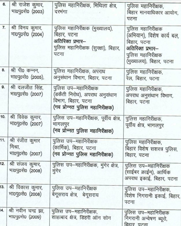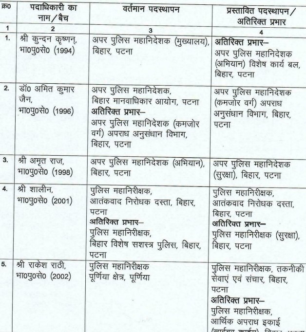 - इसके अलावा, सुशील कुमार को मुजफ्फरपुर का वरीय पुलिस अधीक्षक बनाया गया है।
