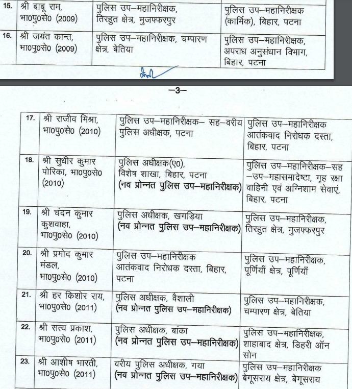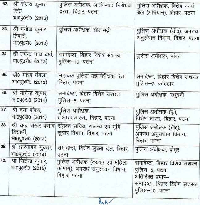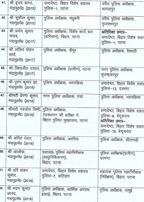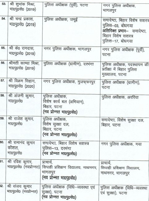 - हरिमोहन शुक्ला को कैमूर, योगेंद्र कुमार को मधुबनी और उपेंद्र नाथ गुप्ता को बांका का एसपी बनाया गया है।
