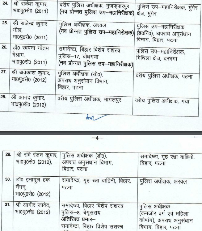 वहीं, अरवल के एसपी भी बदले गए हैं। अब डॉ इनामूल हक को अरवल का नया एसपी बनाया गया है। इसके आलवा, राकेश कुमार को मुंगेर का डीआईजी बनाया गया है।