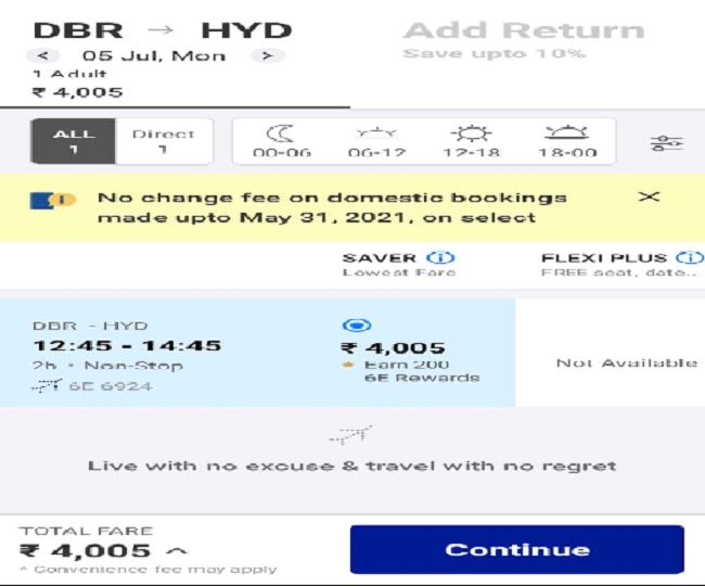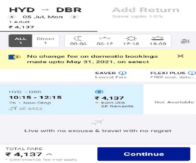 दरअसल, दरभंगा के स्थानीय जनप्रतिनिधि और इंडिगो प्रबंधन की ओर से यहां से हवाई सेवा (indigo darbhanga flight) आरंभ करने की लगातार कोशिश चल रही थी, लेकिन इंफ्रास्ट्रक्चर की कमी के कारण इसकी अनुमति नहीं मिल पा रही थी। अब अंतत: इसको शुरू करने की स्वीकृति दे दी गई है। बुकिंग आरंभ किया गया है। अभी एक ही उड़ान (indigo flight) शुरू होने जा रही है। पांच जुलाई को सुबह 10:15 बजे विमान हैदराबाद से उड़कर 12:15 बजे यहां दरभंगा लैंड करेगा। इस तरह से देखा जाए तो कुल दो घंटे की यात्रा होगी। इसकी बुकिंग 4 हजार 137 रुपये में हो रही है। इसके बाद यही विमान दोपहर बाद 12:45 बजे दरभंगा से उड़ान भरकर 14:45 बजे हैदराबाद लैंड करेगा। इसके लिए अभी बुकिंग 4 हजार 5 रुपये में हो रही है।