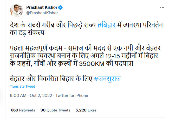 पटना, आनलाइन डेस्क। Jan Suraj Yatra: चुनावी रणनीतिकार प्रशांत किशोर (Prashant Kishor) या (PK) अब सक्रिय राजनीति (Prashant Kishor in Active Politics) में सक्रिय दिख रहे हैं। जन सुराज यात्रा (Jan Suraj Yatra) के तहत उन्होंने महात्मा गांधी की जयंती (Mahatma Gandhi Birth Anniversary) के अवसर पर इसकी शुरुआत की है। स्थल है बिहार के पश्चिमी चंपारण का महात्मा गांधी से जुड़ा भितिहरवा गांधी आश्रम। करीब सवा साल तक चलने वाली 3500 किमी की अपनी इस पदयात्रा की शुरुआत उन्होंने मंदिर में पूजा-अर्चना करने के बाद की। पदयात्रा के दौरान वे पटना या दिल्ली नहीं आएंगे।