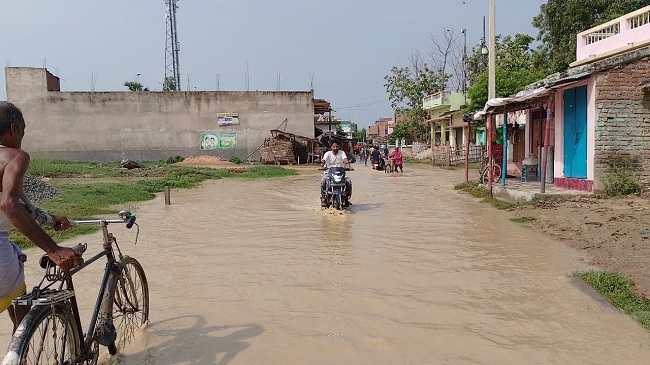 परिहार के लहुरिया बाजार में सड़क पर फैला बाढ़ का पानी।