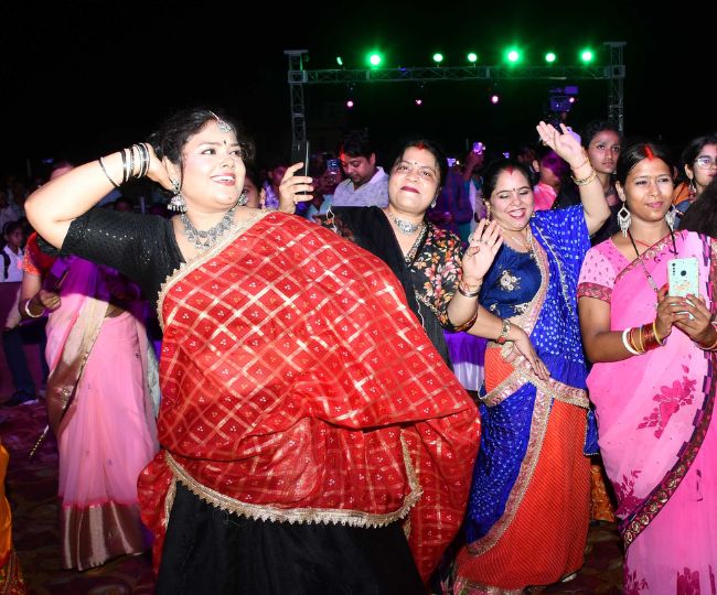 रंग-बिरंगे परिधानों से सजीं महिलाओं की टोली डांडिया कर रही थीं तो कई जगह जोड़े सामूहिक डांस कर रहे थे। भोजपुरी अभिनेत्री के साथ हर तरफ डांडिया उत्सव का जोश और उमंग रहा।