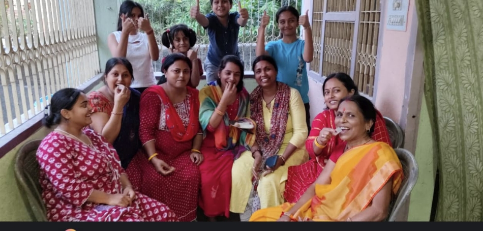 वैभव की बुआ दादी को मिठाई खिलाती हुई। (पीली साड़ी में)। सौ. स्वयं