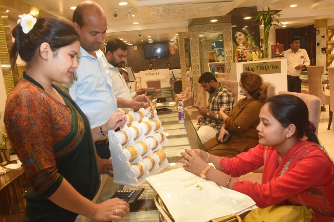 दुकान पर गहनों की जानकारी लेते ग्राहक।