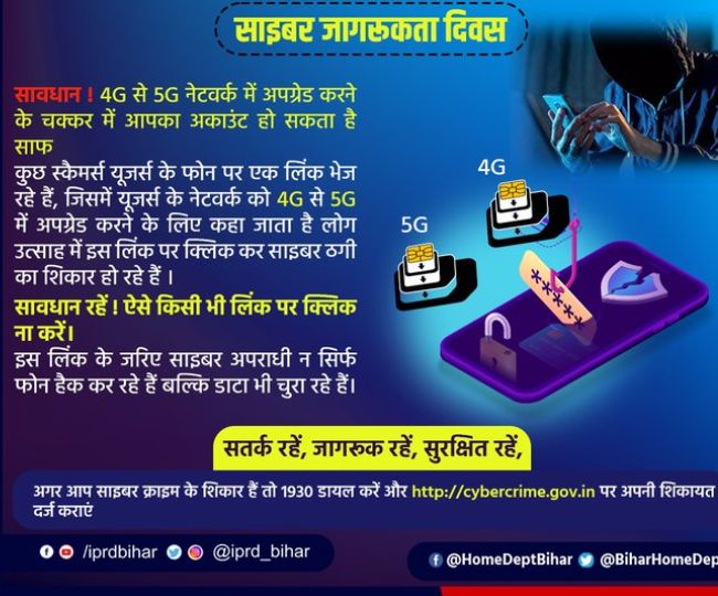 बिहार सरकार के गृह विभाग के अंतर्गत आर्थिक अपराध इकाई ने एक सतर्कता संदेश जारी करते हुए बताया है कि 5जी में अपग्रेड करने के लिए किसी भी लिंक पर क्लिक करना आपके लिए नुकसानदेह साबित हो सकता है। ऐसा करने से आपका बैंक खाता खाली हो सकता है। दरअसल, 5जी में अपग्रेड करने वाले संदेश आपको संबंधित सेवा प्रदाता की बजाय साइबर अपराधियों की ओर से भेजे जा रहे हैं। इस लिंक के जरिए वे आपका डाटा चुराते हैं।