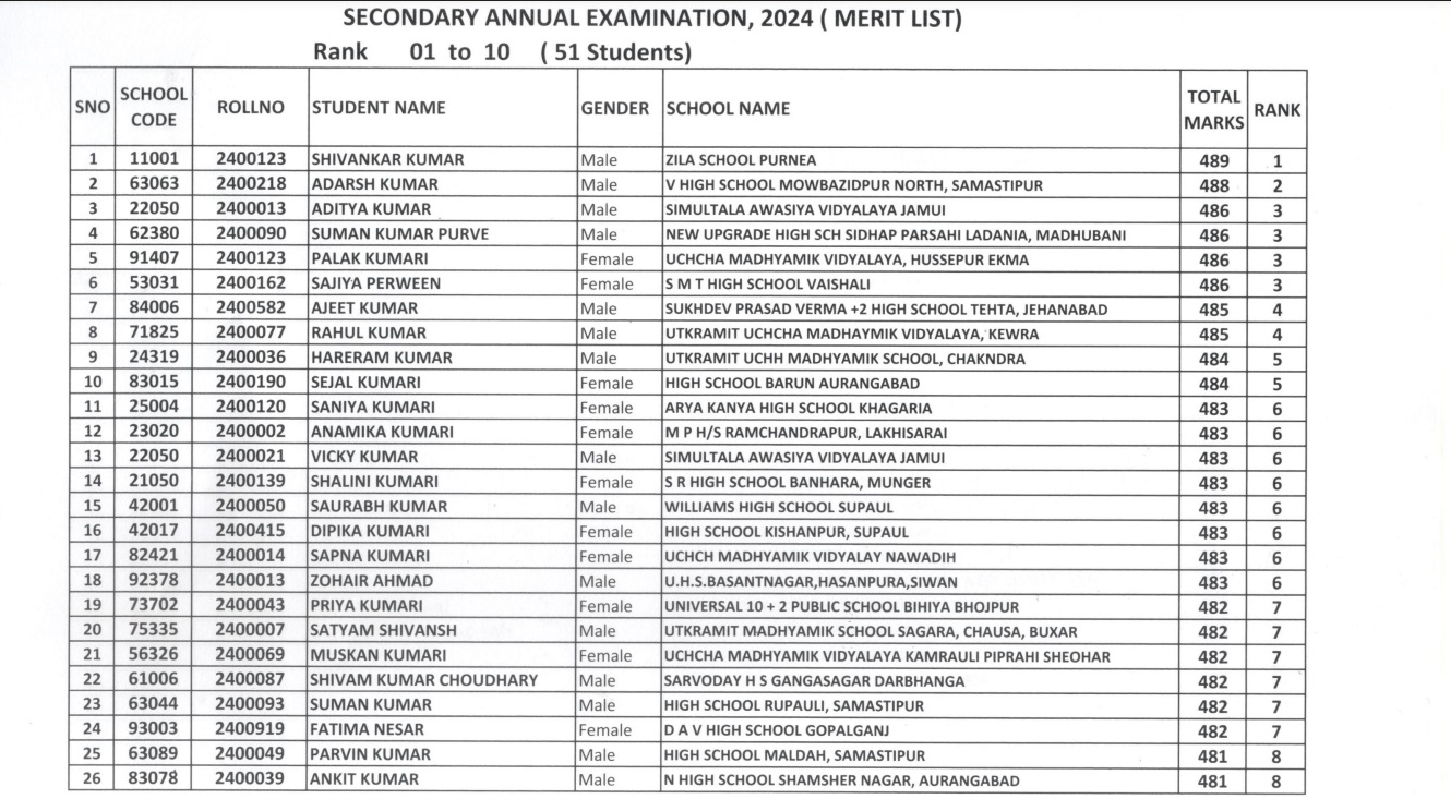 इस बार लगभग 17 लाख छात्र-छात्राओं ने परीक्षा दी थी। इस बार पूर्णिया के शिवांकर कुमार 489 अंकों के साथ टॉपर बने हैं। इस बार टॉप 10 में कुल 51 छात्र-छात्राएं शामिल हैं। तो वहीं औरंगाबाद के आदित्य कुमार को राज्य में तीसरा स्थान प्राप्त हुआ है।