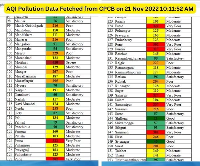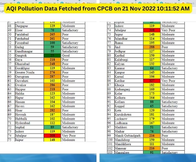 सीपीसीबी की इस सूची में देश भर के कुल 167 शहरों का आंकड़ा शामिल किया गया है। इनमें कुल 13 शहर रेड जोन में हैं। आपको यह जानकर ताज्जुब हो सकता है कि 13 में से नौ शहर केवल बिहार के हैं। इनके अलावा रेड जोन वाले शहरों में देश की राजधानी दिल्ली के अलावा मध्य प्रदेश और महाराष्ट्र का एक-एक शहर शामिल है। रेड जोन वाले शहरों में दिल्ली 316, जबलपुर 308, पुणे में 302, सिंगरौली 301 एक्यूआइ के साथ शामिल हैं।