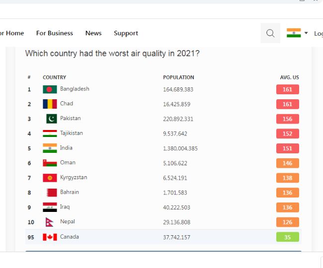 हवा की गुणवत्ता के मामले में विकसित देशों के मानक थोड़े अलग हैं। वायु गुणवत्ता के मामले में भारत की स्थिति काफी खराब है। बांग्लादेश और पाकिस्तान जैसे देश ही खराब वायु के मामले में भारत से ऊपर हैं। इसके पीछे बड़ा कारण इन देशों की सघन आबादी और अर्थव्यवस्था का विकासशील या अविकसित होना है। इसे ऐसे समझें कि पिछले साल कनाडा का औसत एक्यूआइ 35 जबकि भारत का 151 था।