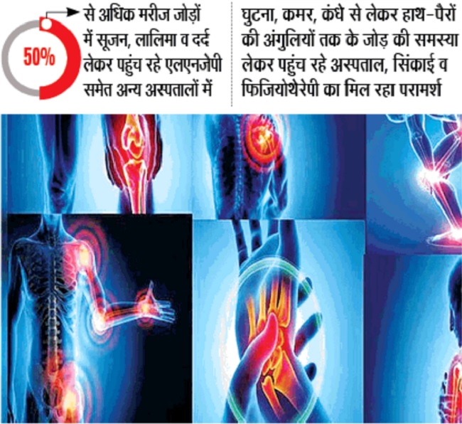 हाथ-पैर, घुटने व कंधे समेत तमाम जोड़ों से राहत के लिए बड़ी संख्या में मरीज एलएनजेपी हड्डी हास्पिटल, पीएमसीएच व एनएमसीएच पहुंच रहे हैं। आईजीआईएमएस के फिजियोथेरेपी विभाग में भी रोगियों की संख्या करीब दोगुनी हो गई है।
