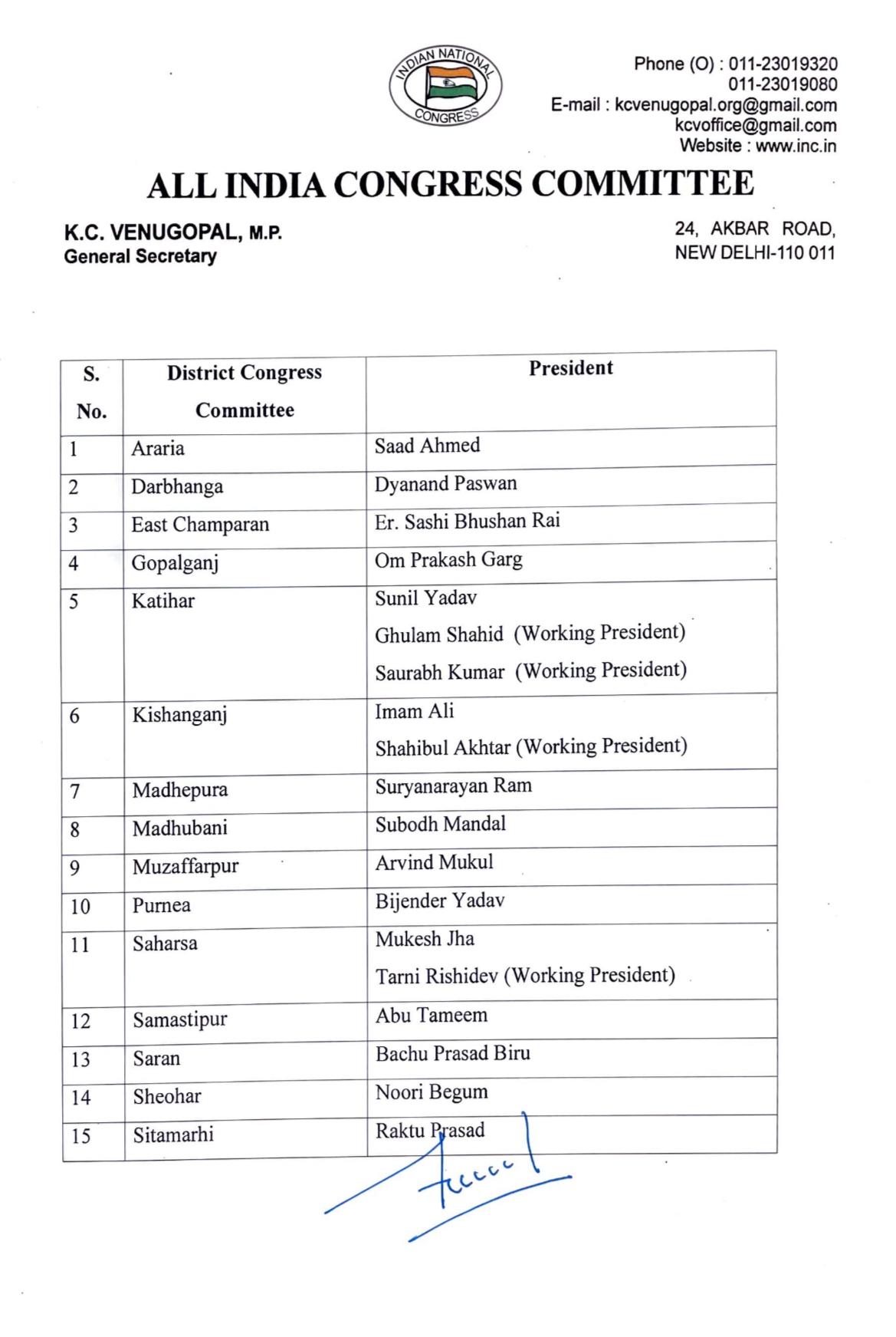 अखिल भारतीय कांग्रेस कमेटी (एआईसीसी) ने मंगलवार को बिहार में कई जिला कांग्रेस कमेटियों के नए अध्यक्षों की घोषणा की। पार्टी महासचिव के.सी. वेणुगोपाल ने इन नियुक्तियों को मंजूरी दी। आधिकारिक सूची के अनुसार साद अहमद को अररिया जिला कांग्रेस कमेटी का अध्यक्ष नियुक्त किया गया है जबकि दयानंद पासवान दरभंगा इकाई का नेतृत्व करेंगे। नीचे खबर में पढ़ें पूरी सूची।
