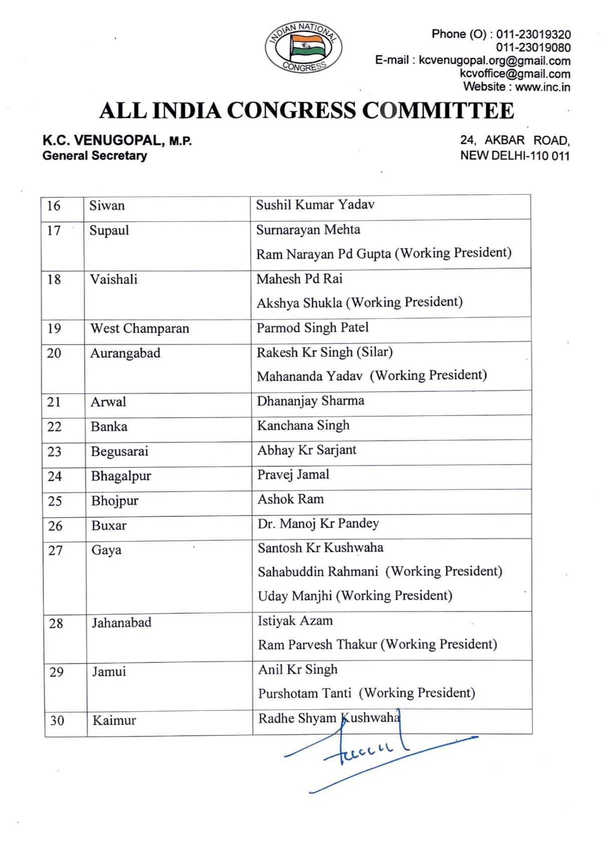 इसी प्रकार अररिया में शाद अहमद, दरभंगा में दयानंद पासवान, पूर्वी चंपारण में इंजीनियर शशि भूषण राय, गोपालगंज में ओमप्रकाश गर्ग, कटिहार में सुनील यादव के साथ दो कार्यकारी अध्यक्ष भी नियुक्त किए गए हैं। किशनगंज में इमाम अली के अलावा शाहिबुल अख्तर को कार्यकारी अध्यक्ष बनाया गया है।