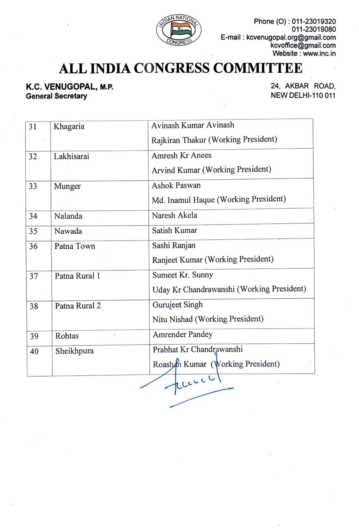 वहीं जहानाबाद में इश्तियाक आजम, जमुई में अनिल कुमार, सिंह कैमूर में राधेश्याम कुशवाहा, खगड़िया में अविनाश कुमार अविनाश, लखीसराय में अमरेश कुमार अनीश मुंगेर में अशोक पासवान,रोहतास में अमरेंद्र पांडे और शेखपुरा में प्रभात कुमार चंद्रवंशी को अध्यक्ष बनाया गया है।