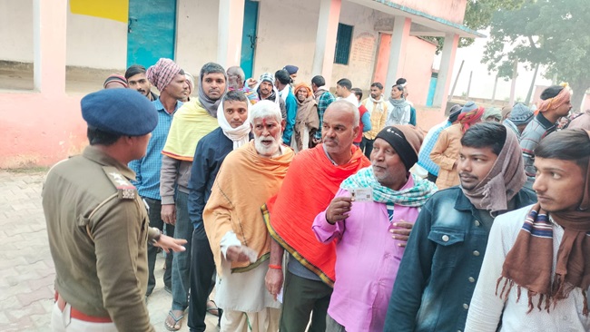 सारण के मढ़ौरा प्रखंड स्थित मिर्जापुर मतदान केन्द्र पर मतदान करने पहुंचे मतदाता।