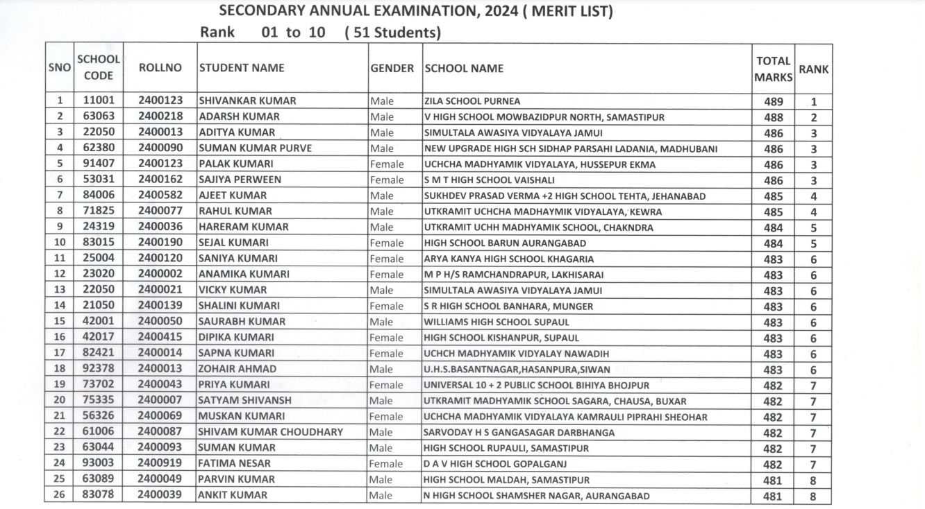 डिजिटल डेस्क, पटना। Bihar Board Matric Result 2024: बिहार बोर्ड ने आज 10वीं का रिजल्ट घोषित कर दिया है। इसबार 82.91 फीसदी छात्र-छात्राओं ने बाजी मारी है। इसके साथ ही टॉपरों की लिस्ट भी जारी कर दी गई है। पहले स्थान पर इसबार पूर्णिया का शिवांकर कुमार (Shivankar Kumar) रहे। उन्होंने 489 अंक प्राप्त किया है। टॉप 10 में 23 लड़कियां शामिल हैं।