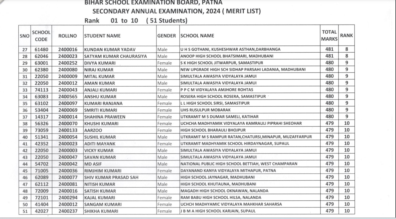 समस्तीपुर के वी हाई स्कूल मोवाजिदपुर उत्तरी के आदर्श कुमार 488 अंकों के साथ दूसरे स्थान पर रहे हैं। जबकि, तीसरे स्थान पर 486 अंकों के साथ चार परीक्षार्थी जमुई के सिमुलतला आवासीय विद्यालय के आदित्य कुमार, मधुबनी के न्यू अपग्रेड हाई स्कूल सिधाप परसाही के सुमन कुमार पूर्वे, सारण के उच्च माध्यमिक विद्यालय हुस्सेपुर एकमा की पलक कुमारी तथा वैशाली के एसएमटी हाई स्कूल की साजिया परवीन हैं। टाप 10 में शामिल 26 परीक्षार्थियों में दो जमुई के सिमुलतला आवासीय विद्यालय के हैं।