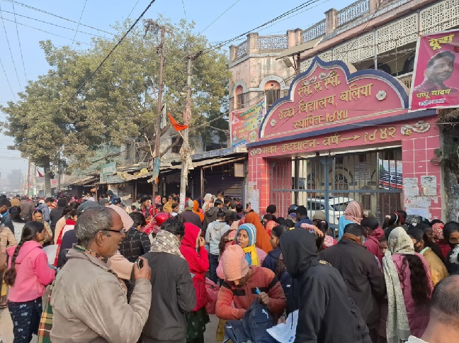 बेगूसराय के बीएसएस कॉलेजिएट स्कूल पर लगी परीक्षार्थियों की भीड़।