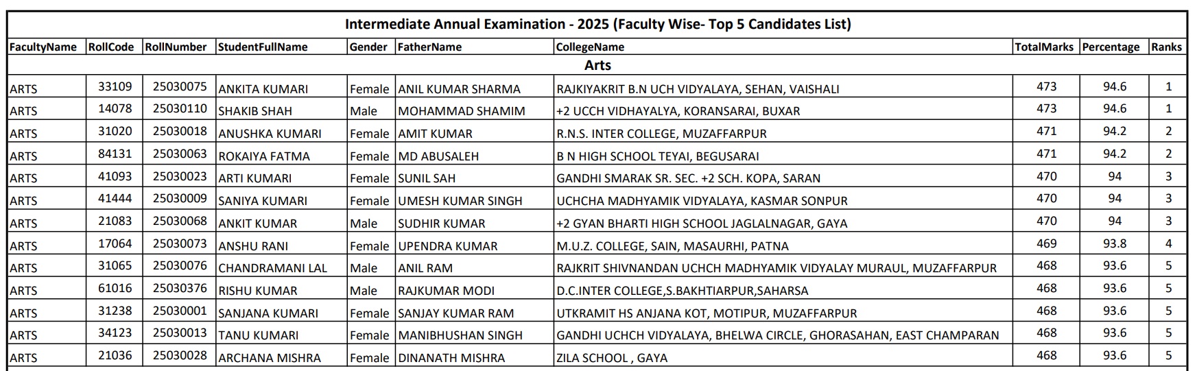 आर्ट्स विषय में अंकिता कुमारी और शाकिब शाह ने 473 अंक के साथ (94.6 फीसदी) पूरे बिहार में टॉप किया है।