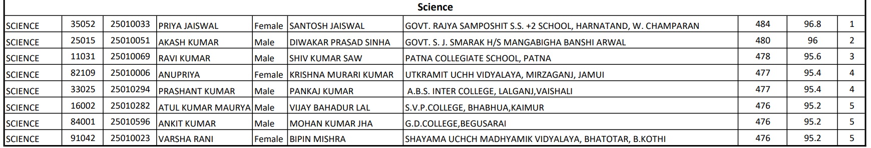 साइंस में प्रिया जायसवाल ने 484 नंबर और 96.8 फीसदी के साथ बिहार टॉप किया है। प्रिया के बाद दूसरे नंबर पर आकाश कुमार रहे। सेकंड टॉपर आकाश को 480 नंबर और 96 फीसदी मिले।