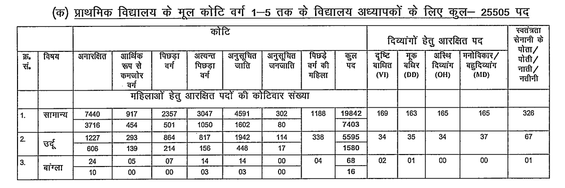 आयोग ने बुधवार को विज्ञप्ति जारी कर बताया कि शिक्षा विभाग के प्राथमिक विद्यालय (कक्षा एक से पांच) में अध्यापकों के 25 हजार 505 तथा मध्य विद्यालय (कक्षा छह से आठ) में 18 हजार 973 पद चिह्नित हैं। इसमें सामान्य विषय के 19 हजार 842, उर्दू के पांच हजार 595 तथा बांग्ला के 68 पद हैं।