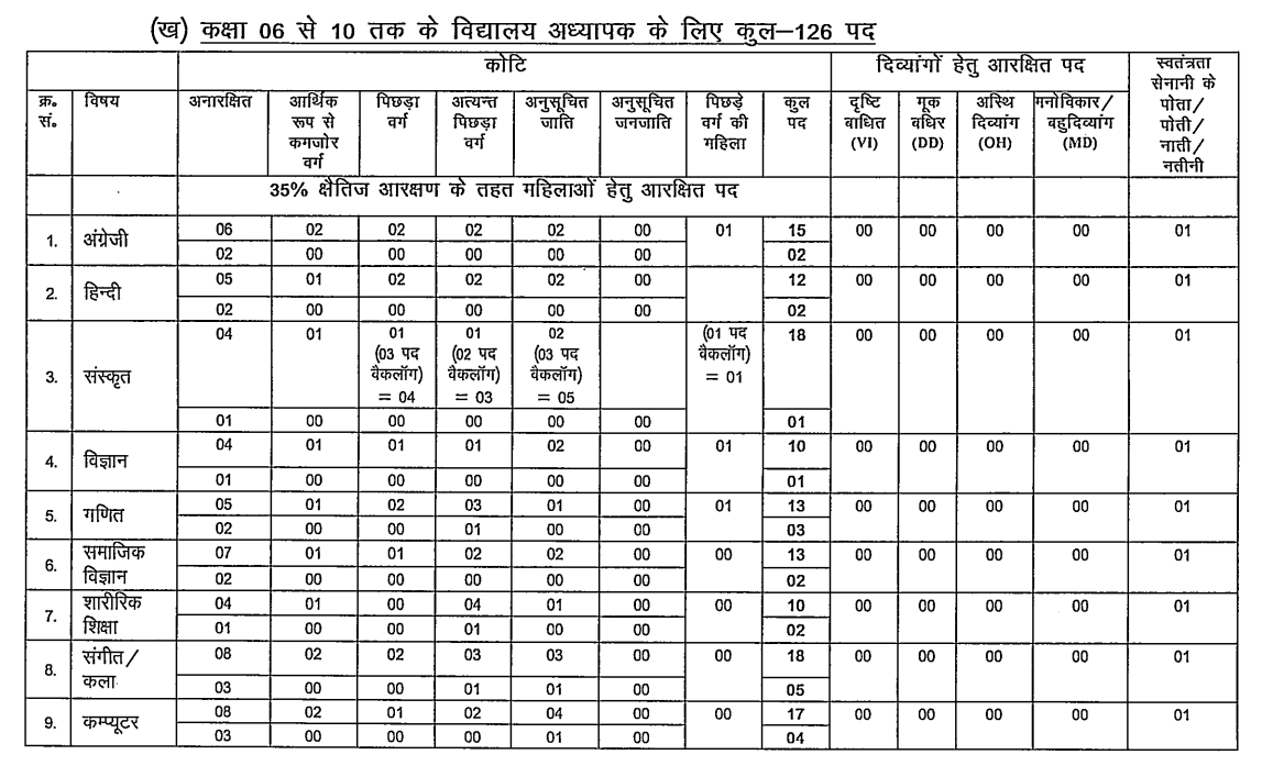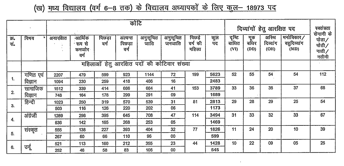 मध्य विद्यालयों में गणित एवं विज्ञान के पांच हजार 623, सामाजिक विज्ञान के तीन हजार 789, हिंदी के दो हजार 813, अंग्रेजी के तीन हजार 494, संस्कृत के एक हजार 826 तथा उर्दू के एक हजार 428 पद हैं।