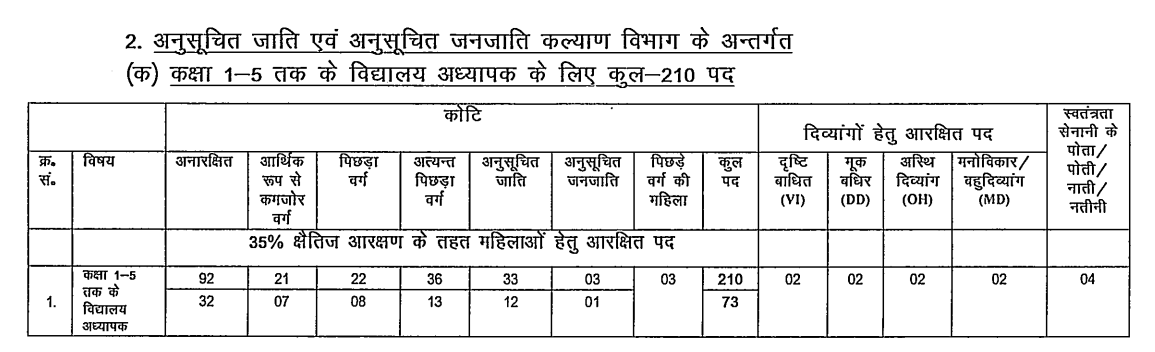 आयोग की वेबसाइट पर विषयवार और श्रेणीवार रिक्तियाें की सूची जारी कर दी गई है। वहीं, अनुसूचित जाति एवं अनुसूचित जनजाति कल्याण विभाग के प्राथमिक विद्यालयों में 210 तथा मध्य विद्यालयों में 126 पद चिह्नित हैं।