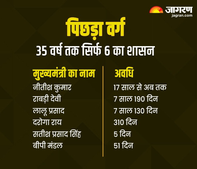 पिछड़ा व अति पिछड़ा वर्ग की सत्ता के शीर्ष का पद विगत 35 वर्षों में सात लोगों के बीच ही रहा। नीतीश कुमार (Nitish Kumar) 17 सालों से अधिक समय से मुख्यमंत्री हैं। राबड़ी देवी (Rabri Devi) सात वर्ष 190 दिनों तक मुख्यमंत्री रहीं। लालू प्रसाद सात वर्ष 130 दिनों तक मुख्यमंत्री रहे।